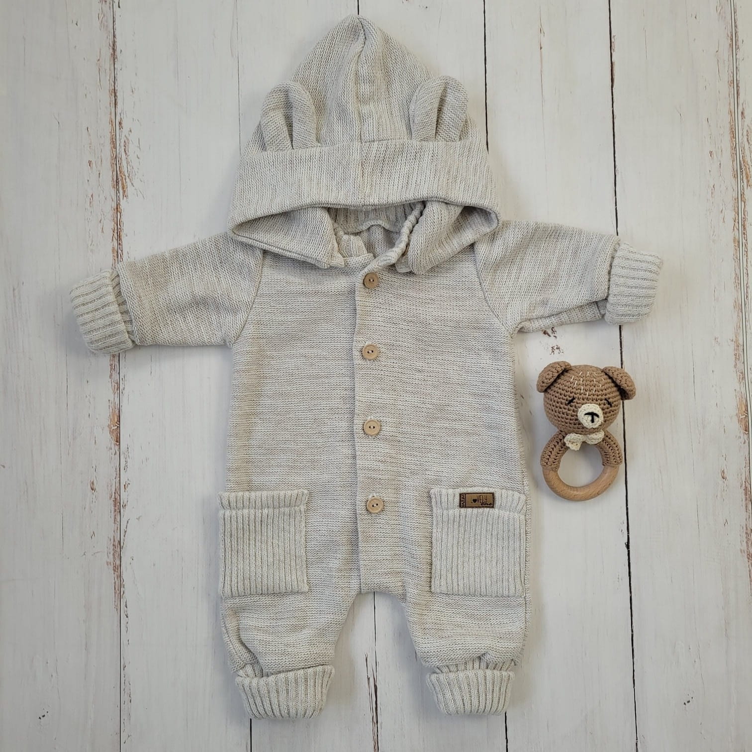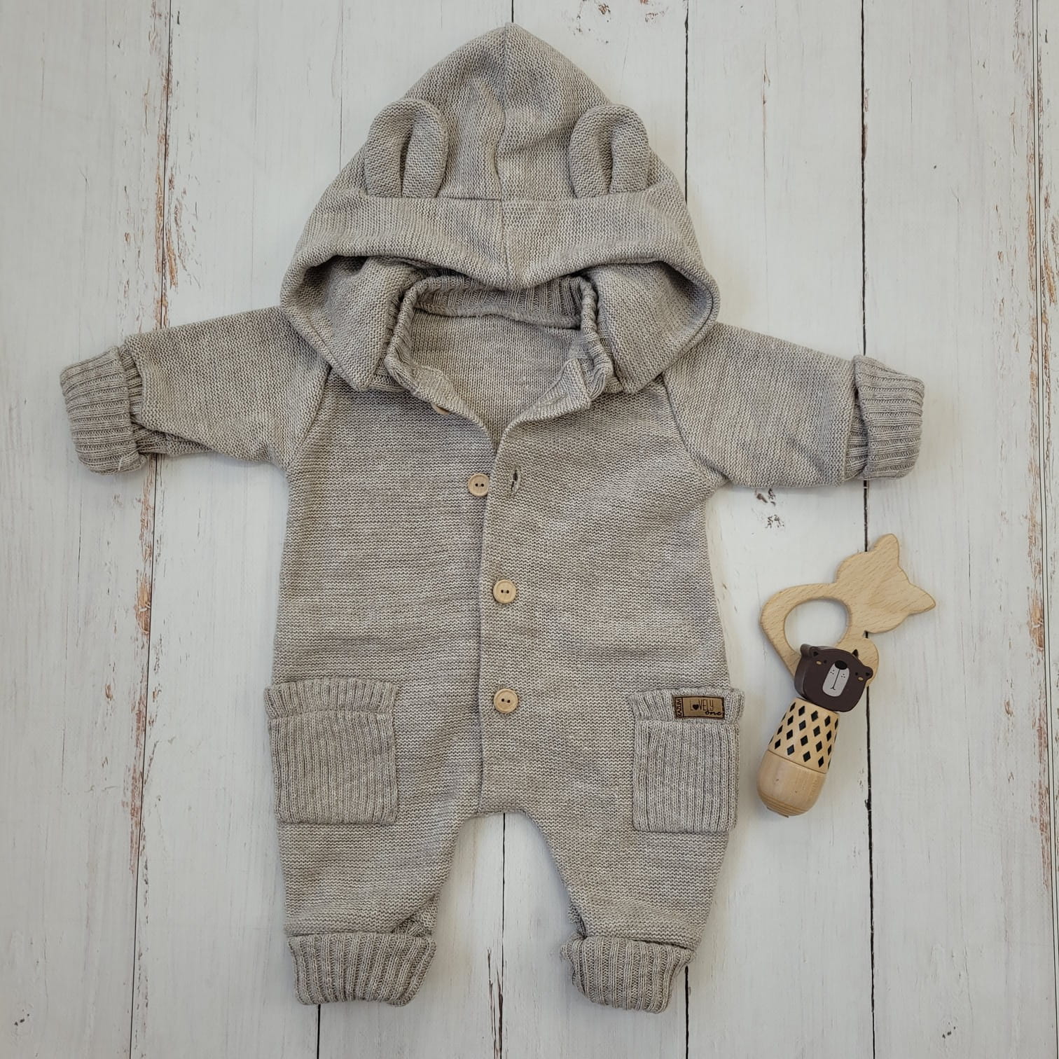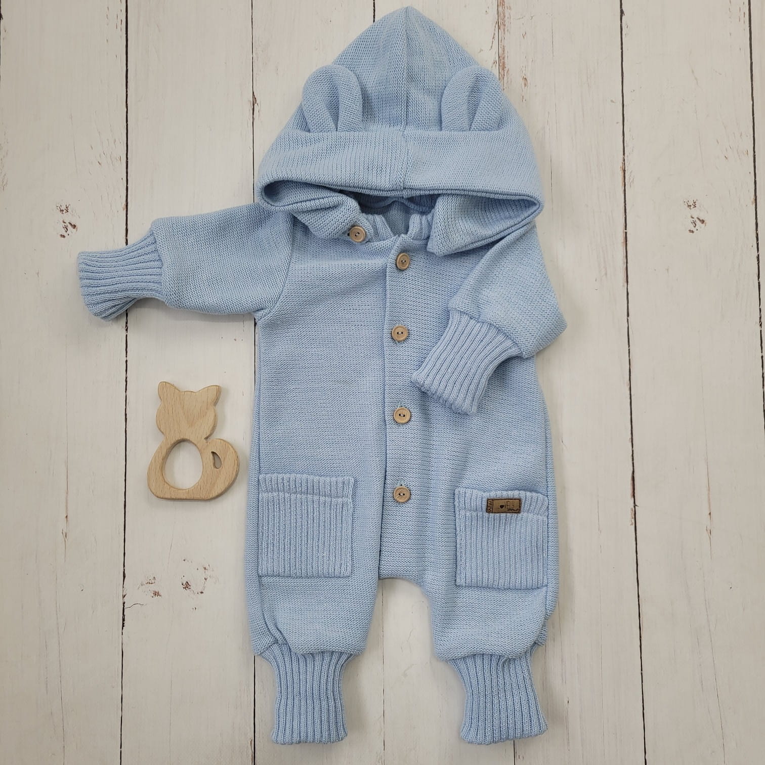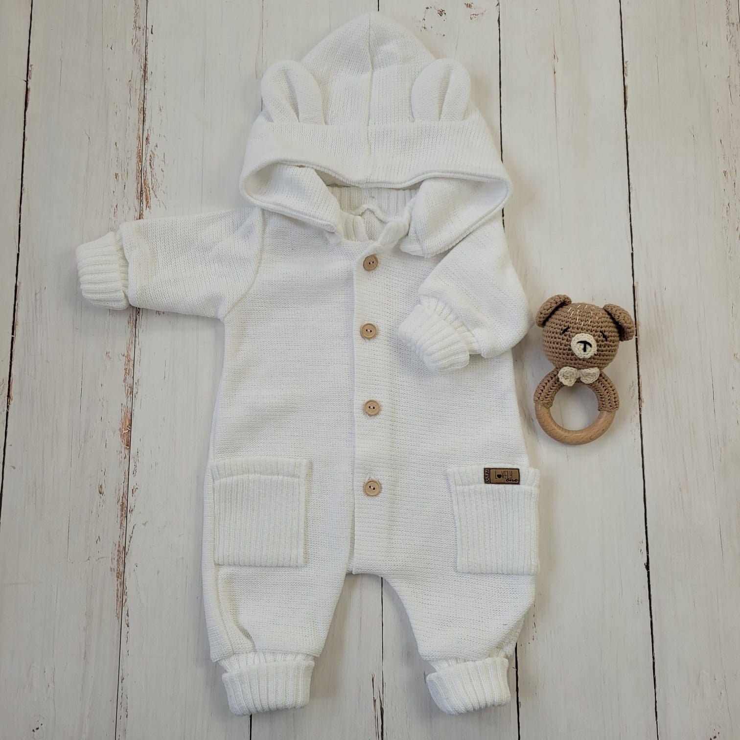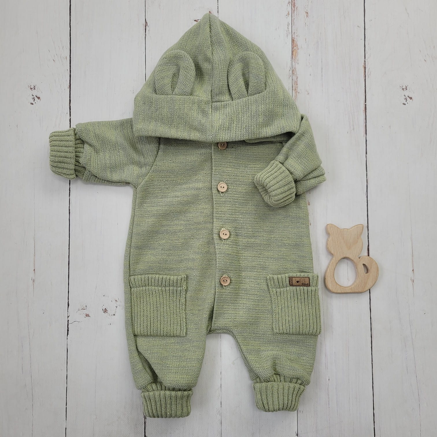 Ez a különleges, gombos kötött overál levehető, mély kapucnival készült, amelyet bájos fülecskék díszítenek. A praktikus, hosszú passzéknek köszönhetően együtt nő a babával, így hosszabb ideig hordható.