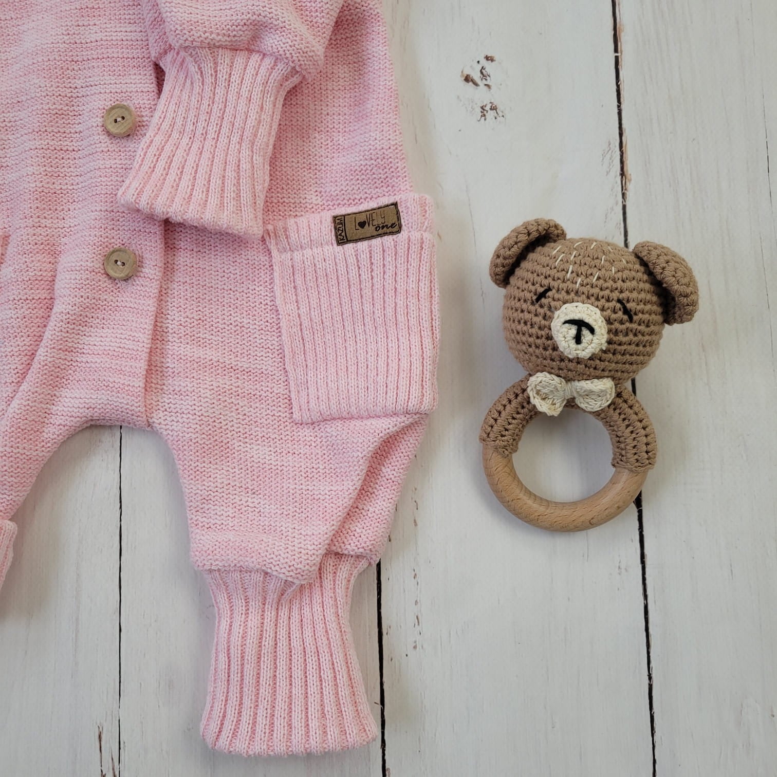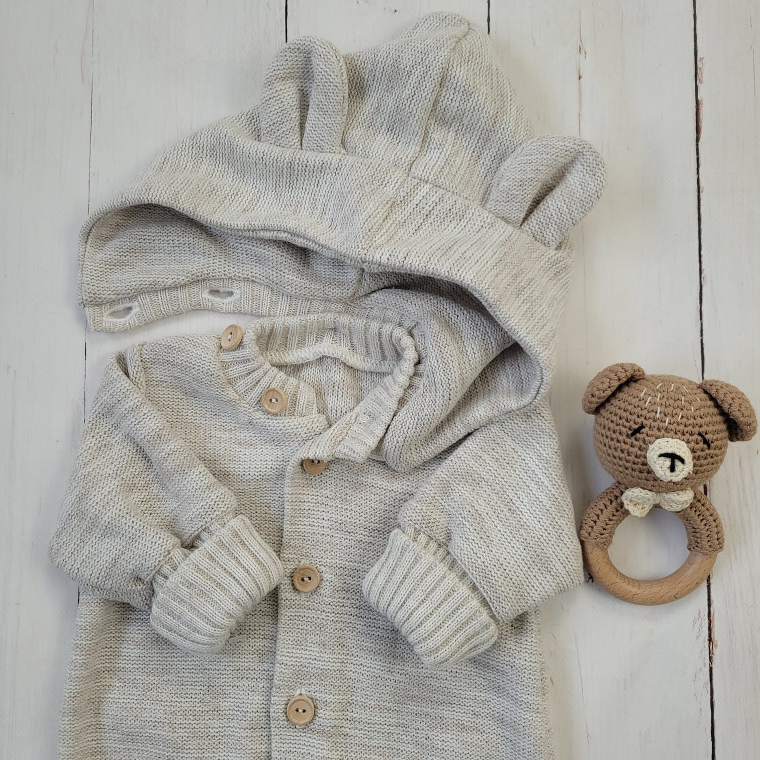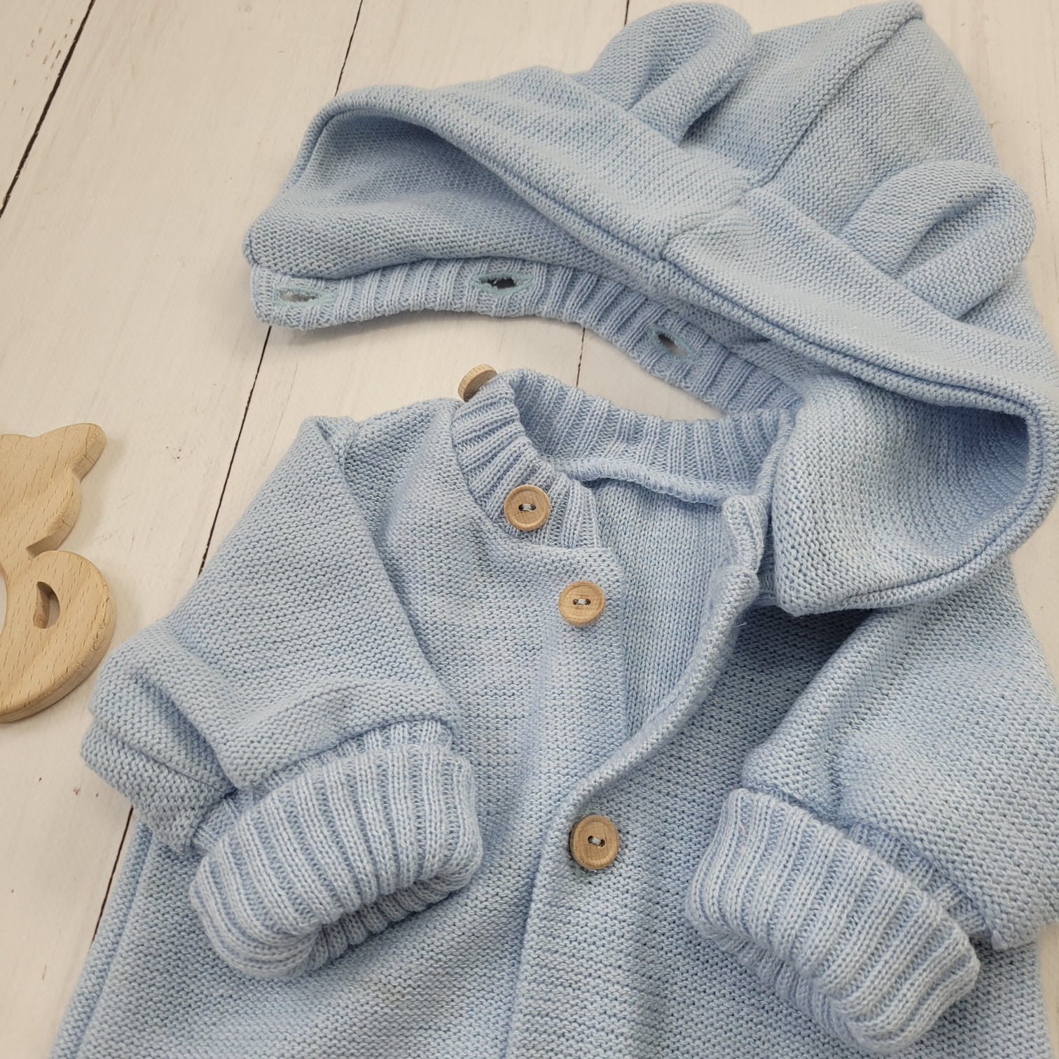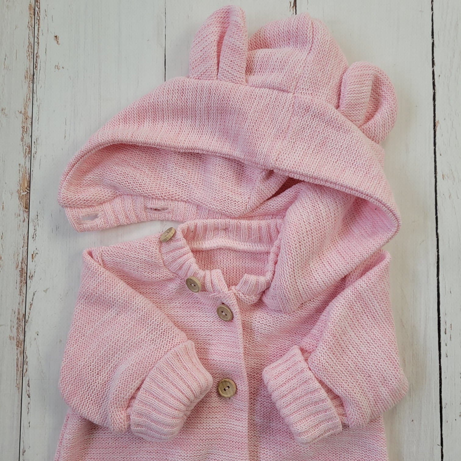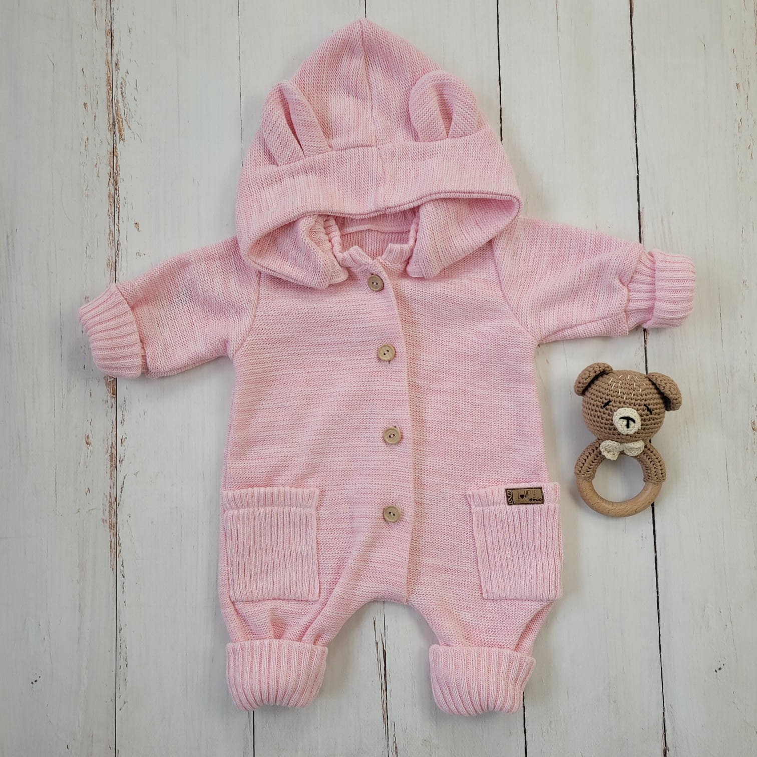 Ez a különleges, gombos kötött overál levehető, mély kapucnival készült, amelyet bájos fülecskék díszítenek. A praktikus, hosszú passzéknek köszönhetően együtt nő a babával, így hosszabb ideig hordható.