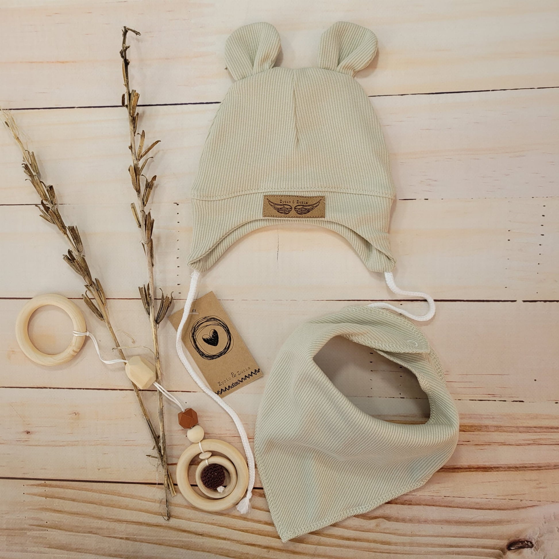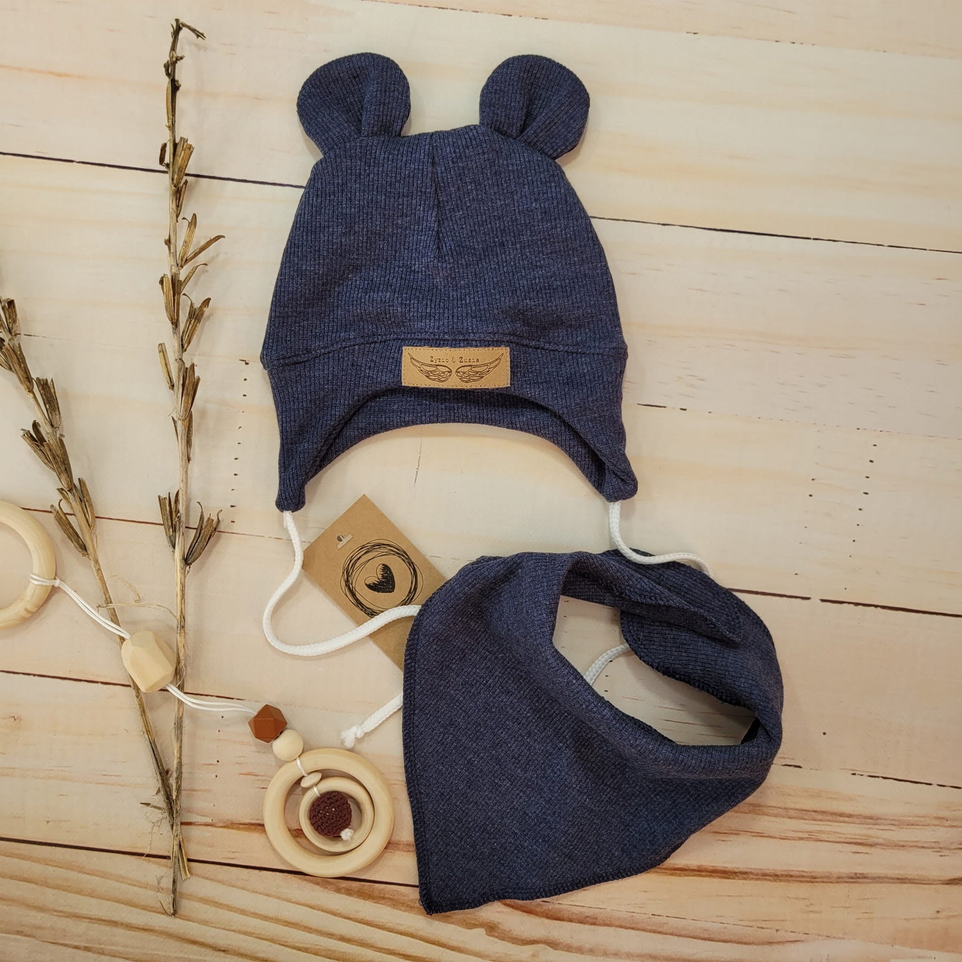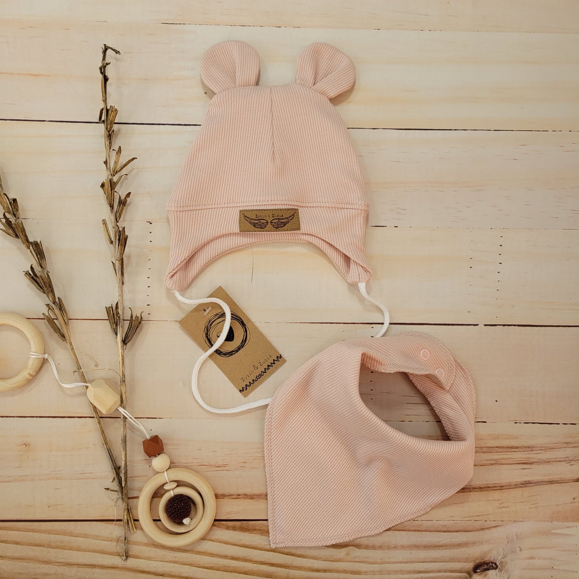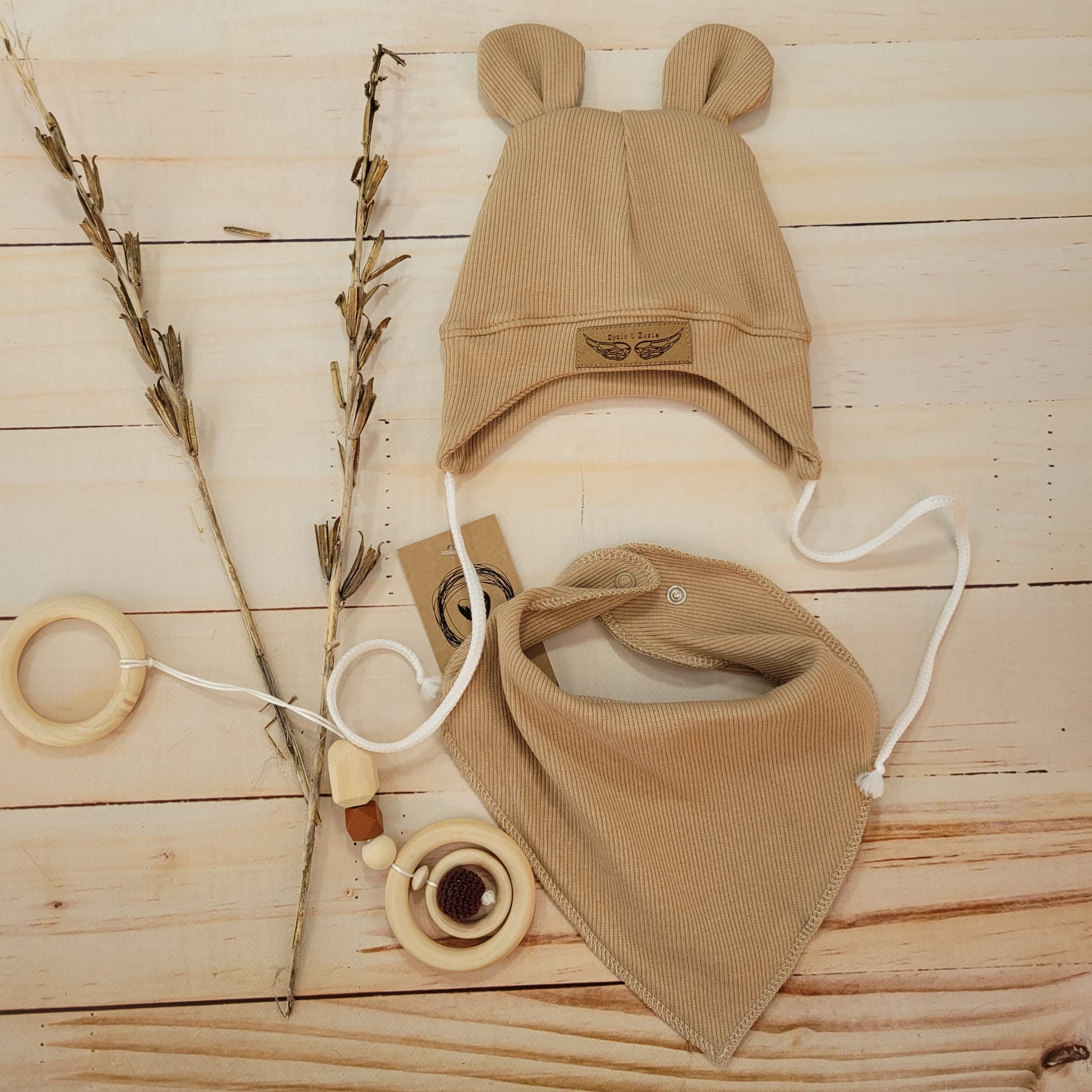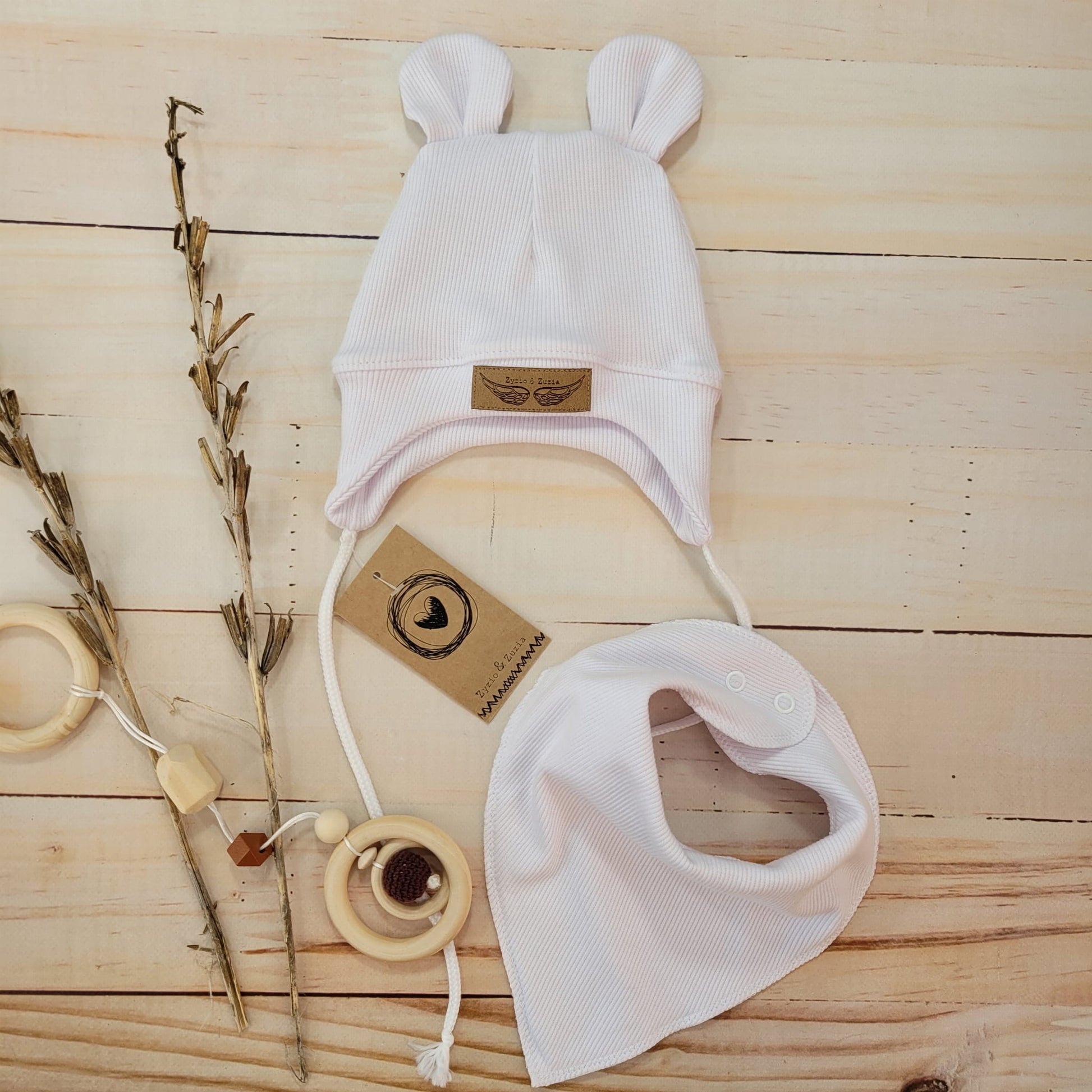 Ez a bájos, bordázott sapka és a hozzá tartozó kendő tökéletes választás a hűvösebb napokra. A sapka kétszeres pamutréteggel készült, aranyos fülecskékkel, így nemcsak melegen tartja a kis fejét a gyermeknek, hanem ellenállhatatlanul cuki is. A rugalmas bordázott anyag gyengéden öleli körbe a baba fejét és fülét, megvédve a széltől és hidegtől.